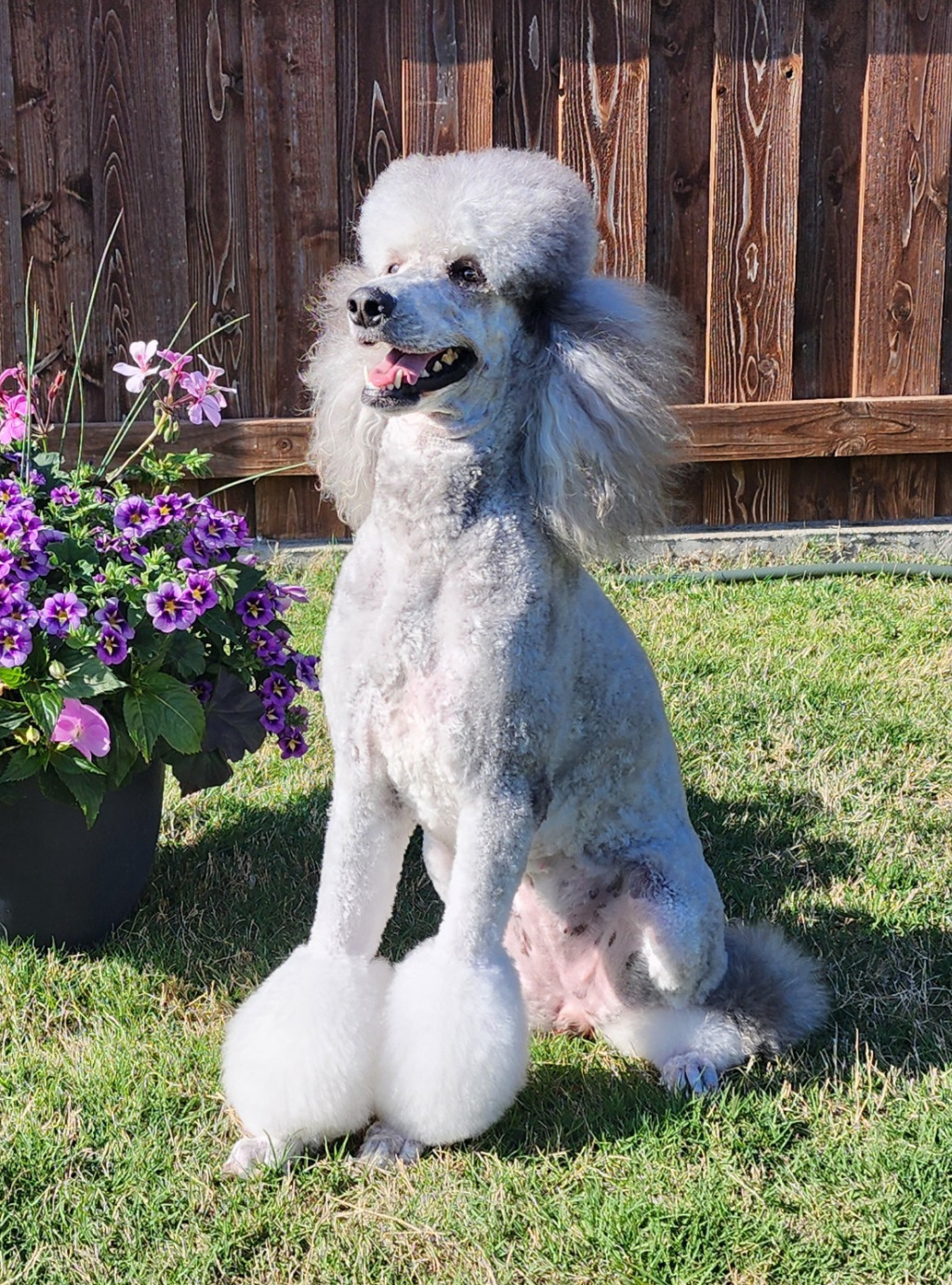Lady was born in Sioux Falls, South Dakota, in 2022. Lady has an outstanding lineage and comes with the most stunning pedigree and health history. She has a stunning coat of light gray, dark gray, and white. Lady is a Silver Phantom Standard Poodle. Her 2024 litter will be her first litter.