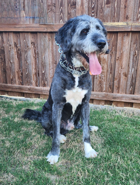 This young man is a local from a farm in Northeast Oklahoma. Hank is a stunning example of an F1 Bernedoodle with a sweet disposition and passion for herding goats, cows, and basically anything that he can herd. His father, Murphy, is a well-known AKC Bernese Mountain Dog in the area, and is mother, likewise, is AKC Registered. Hank is an F1 Bernedoodle and was born in 2019 and he stands 25" at the withers. He comes from a line of very strong, healthy, and gentle Berners and Poodles.